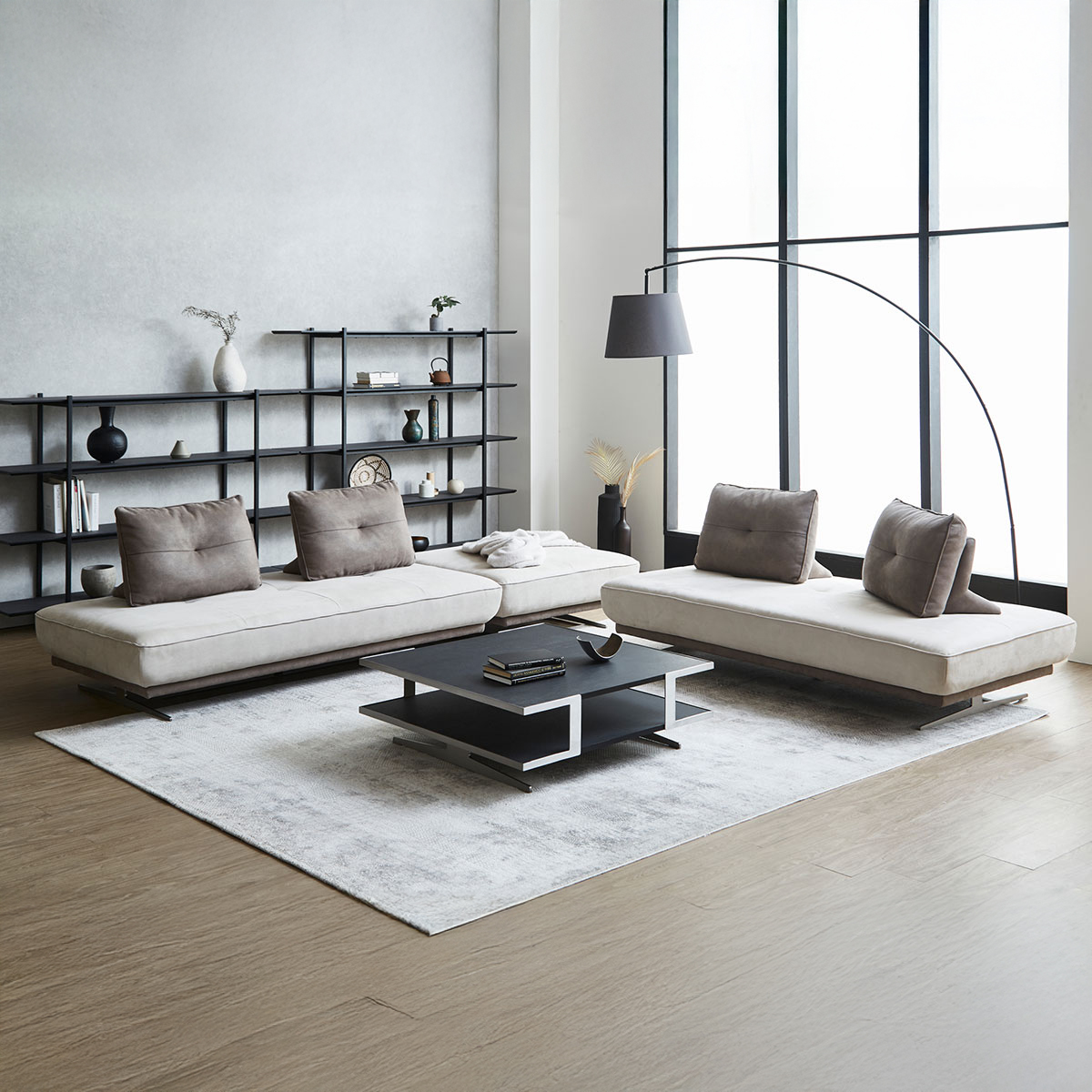 リラックスフォームの「アルフレード」ソファは、シンプルで洗練されたデザインと快適な座り心地で、空間全体を引き締めてくれます。