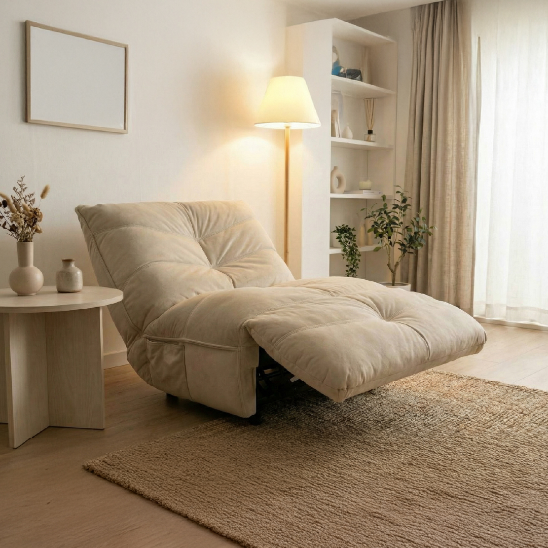 テレビを見る時は少しだけ倒して、お昼寝の時はフルフラットに近い状態に。まるで雲の上にいるような、極上のくつろぎ時間を指一本で手に入れられます。